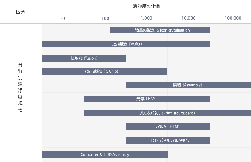 (注:空気清浄度は、0.5㎛以上の粒子が1ft3中に何個含まれているかに応じて、classで表示)