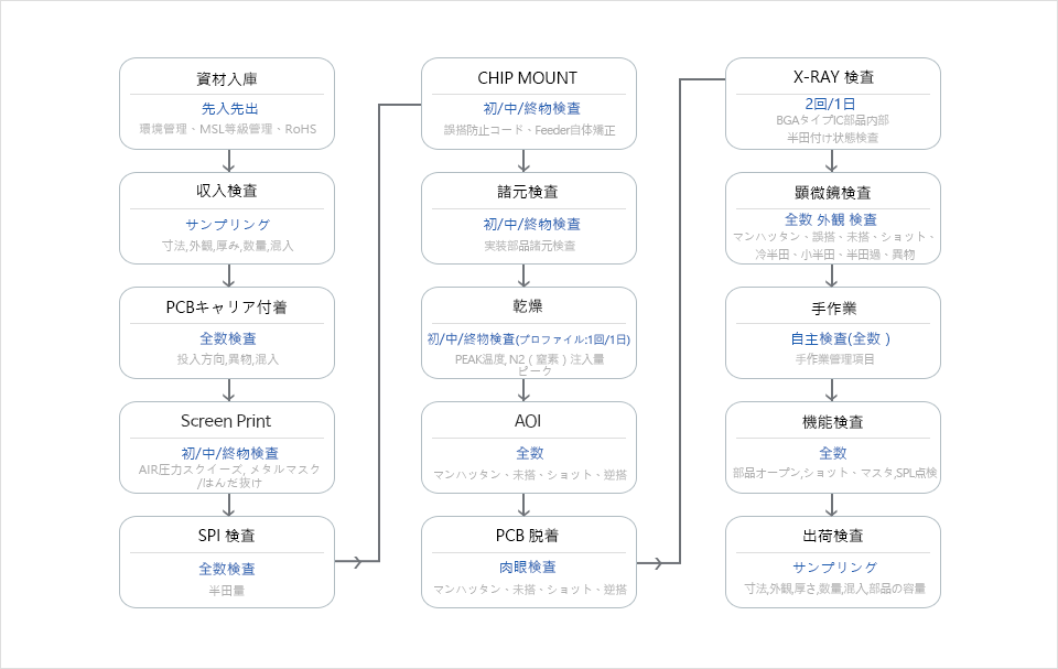 | 外観 | SMT性,PCB,TAPE | 目視/顕微鏡/拡大鏡 | Lot別 |