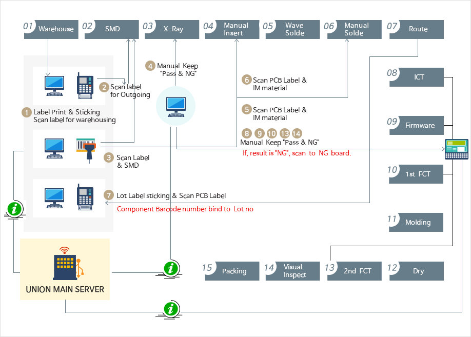 ユニオン UMTSは、製造関連の各工程別にバーコード スキャンを使用した工程進行履歴(ヒューマン, マテリアル, ファシリティ, 失敗の情報)をメインサーバと